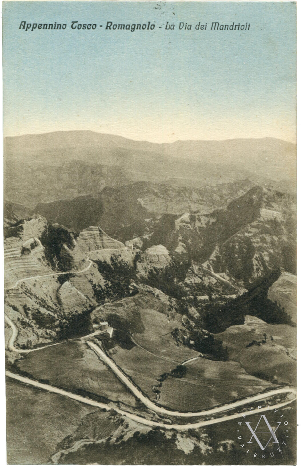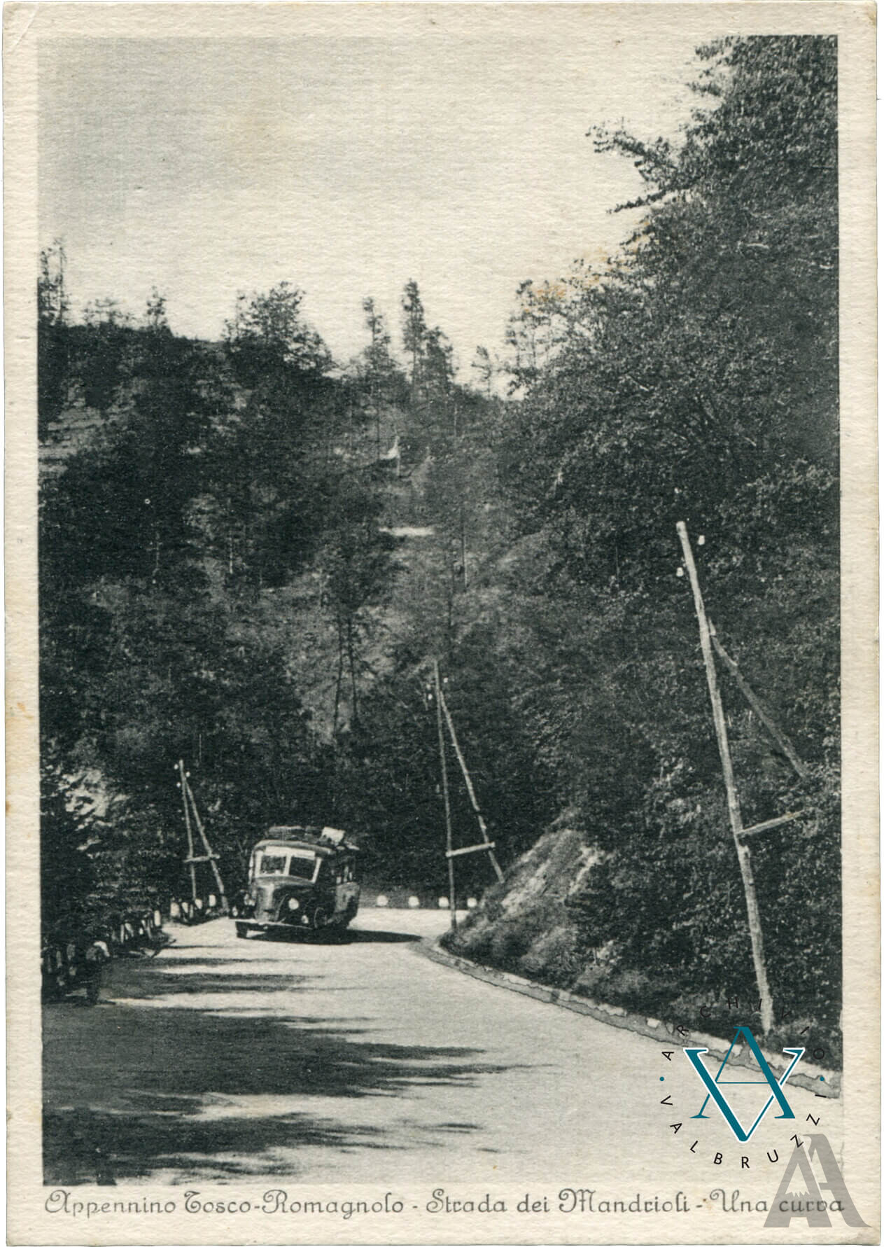 La cartolina ritrae un fermo immagine animato di passeggeri al Passo dei Mandrioli, che non tralasciano l’occasione di farsi immortalare davanti ad un FIAT 28-40HP, chi in piedi e chi dai finestrini. Il 6 settembre 1912 la FIAT, con una cordata di altri azionisti, costituisce la S.I.T.A. (Società Italiana Trasporti Automobilistici), con sede a Torino. La società intraprende essenzialmente la sua primaria attività in tre regioni: Piemonte, Toscana e la Basilicata. In Toscana copre con i suoi omnibus le tratte del Mugello, il Casentino, i Passi della Consuma e dei Mandrioli, raggiungendo i centri abitati di Bagno di Romagna e S. Piero in Bagno.